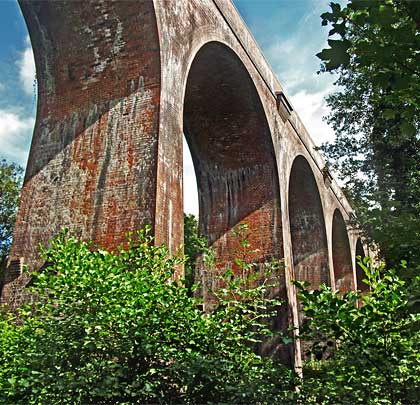 To the north-west of Lletty Brongu Station, the line crossed a stream, Cwm Du, by means of an imposing brick viaduct. Comprising seven 40-foot arches and an eighth of 20 feet within its eastern abutment, the deck reached a height of 80 feet above the water at the centre span. The red brick arches are supported by piers and abutments built of cement concrete faced with brindles. Still apparent half way up the piers are supports for the rakers that helped to brace the arches’ timber centring during construction.