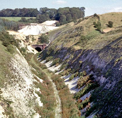 Although the eastern portal of Drewton Tunnel (click here for its full story) has managed to fend-off the dreaded infill, 2,114 yards away, the western end is slowly vanishing. In 1987, its grand approach cutting could still be admired even if a small chalkfall was partly obstructing the entrance. Since then heavy plant has moved in. The top of the portal lurks behind mounds of earth but the casual passer-by would never know what once was there.